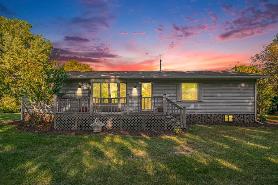 Discover tranquility in this beautifully remodeled ranch home nestled on 4 private acres lined with pear and apple trees! With a spacious deck and peaceful surroundings, this property offers the perfect setting for relaxation and enjoyment. The home features new flooring, remodeled bathrooms, modern light fixtures throughout, blending comfort with contemporary style. Complete rewire and replumbing with new main service water line! All appliances stay! Move in ready home.In addition to the home, you'll find a spacious 4-car garage, complete with a loft offering endless possibilities for a workshop, studio, or additional storage. A large pole barn provides even more storage, making this property ideal for those seeking both space and serenity.