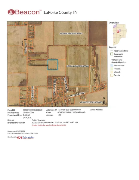 This 10 ( or-) acre parcel is located just southwest of La Porte in the county. A 53' easement offers access back to the 10-acre parcel which is currently being used to farm hay. State Road 2 sits just north of property offering easy access to La Porte - Valparaiso.