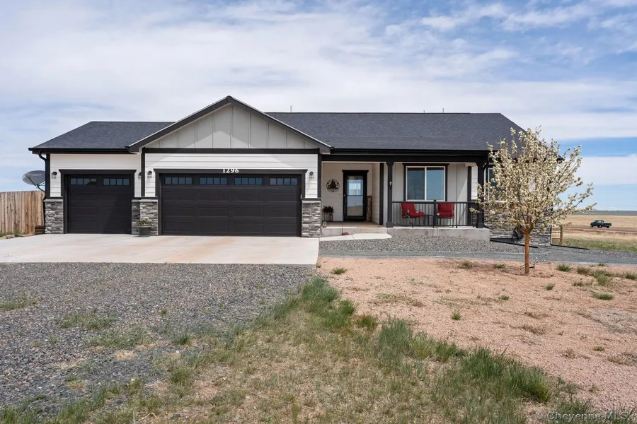 Better than new home. This ranch style home sits just 15 minutes west of town. It sits on just over 5 cres of land and is a close drive to FE Warren AFB or Curt Gowdy State Park. This ranch style home boasts an open floor plan with lots of windows for natural light, 3 bedrooms, a covered front porch, central A/C, fireplace, solid surface counters, luxury vinyl flooring & an oversized 3 car garage. It also has some wonderful landscaping, fenced dog run, and a fenced backyard.