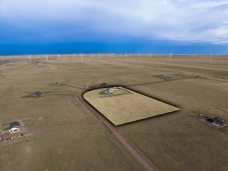 Find home on over 7.5 acres within the secluded neighborhood of Willadsen Estates, where an outdoorsman can ride, stroll, or drive with views of the Rocky Mountains, farms, trees, free roaming wild life, and windmills surrounding you. Built 2021 by Leader Custom Homes as a fully finished 5 bedroom, 3 bathroom, 3 car garage home with upgrades like Anderson windows, 50 year shingles, tankless water heater, and central air. With entertainment in mind; you'll enjoy the extra large concrete back patio with concrete picnic bench and inside the extra large kitchen island with inset sink. The corner lot allows for many options for use and currently has 300 trees on a drip system. You'll be surprised by the quick access to the Colorado State Line, and even access to some state public lands (General Elk 6 & General Deer 61) ; So don't miss out on this fully finished home within a scenic area.