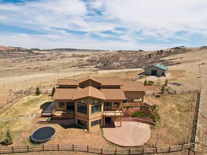 Custom 4200+ square foot home on 36 acres only 20 minutes north of Ft. Collins. Easy commute to Ft. Collins or Laramie. Beautiful country kitchen with pine wood floors, slate tile countertops and cherry cabinets. Incredible vaulted great room with floor to ceiling windows to take advantage of the incredible views. Main floor master with walk-in shower and heated tile floor in bath. Great horse set-up with 4 stall barn, tack room, hay storage w/access to Eagle Nest Open Space & riding trails.