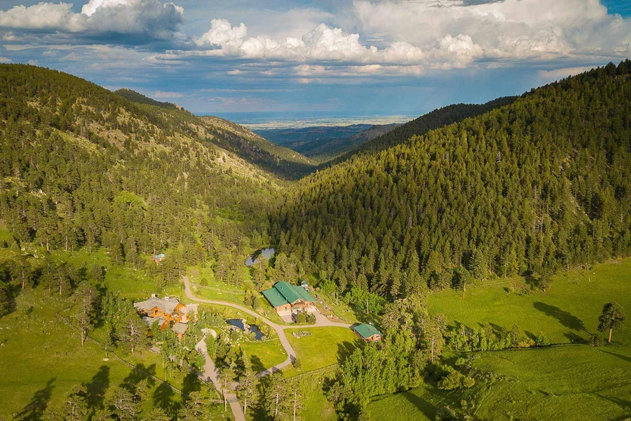 Saddle Notch Ranch is a classic mountain retreat located about 15 minutes drive west of Loveland at the end of a good graveled county road that provides excellent year-round access. It occupies an exceptionally private site completely surrounded by the Arapaho and Roosevelt National Forests. Its 367 deeded acres contain some truly dramatic terrain where high mountain meadows are set against steep cliffs, colorful rock formations and timbered hillsides. The centerpiece of the property is the custom designed nearly 11,000 square foot log home that is almost more of a work of art than a house. A large barn and four bedroom guest house make this an ideal retreat for friends and extended family even though the main house is designed to be comfortable for just the owners when they are there on their own. It doubles as a seasonal retreat or a year-round home just a short drive from the extensive social and cultural amenities of Colorados Front Range.