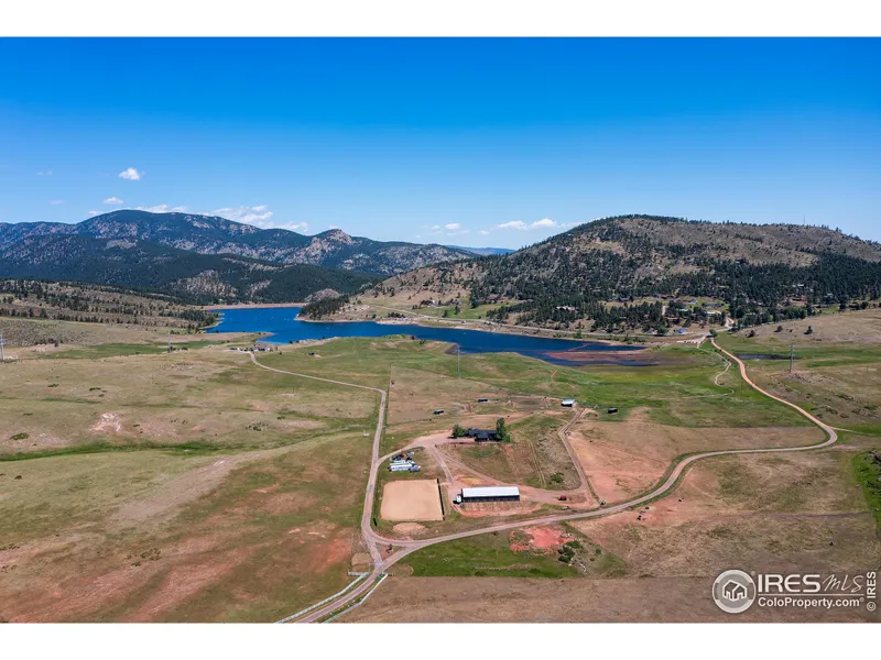 Magical horse property for the true equestrian enthusiast! Experience one of the most picturesque Rocky Mountain locations that backs to Pinewood Reservoir and has views of Longs Peak. See massive herds of migrating elk from your backyard. Or take your fishing pole or kayak down to the Pinewood reservoir. This 40-acre parcel is turnkey for your horses with a newer 96x40 barn with tack area, wash bay and (10) 12x12 stalls and (2) 12x24 foaling stalls, (3) 12x24 run-in sheds plus additional 7-stall barn with 12x24 of storage. Two arenas, hay storage areas, multiple pastures with newer sophisticated fencing system and fencing for numerous dogs. Updated ranch-style home with recently remodeled kitchen and bathrooms, newer flooring, carpet and paint, roof and windows. Bedroom #3 is non-conforming/den. Large decks for outdoor entertaining. Spacious kitchen with SubZero fridge, Viking microwave and quartz counters with ample culinary prep area. Primary bedroom with custom shower, walk-in closet with built-ins. The home is comfortable, spacious and enjoys flexibility, storage and an attached 2-car fully insulated and sheetrocked garage. This location is close to Carter Lake recreation and is only 20 minutes to Berthoud and Loveland. You'll feel like you are on vacation when you're home. The land is adjacent to a ranch that has been owned by the same family for years and is near national forest land. This is a very special and rare property that must be seen to be appreciated.