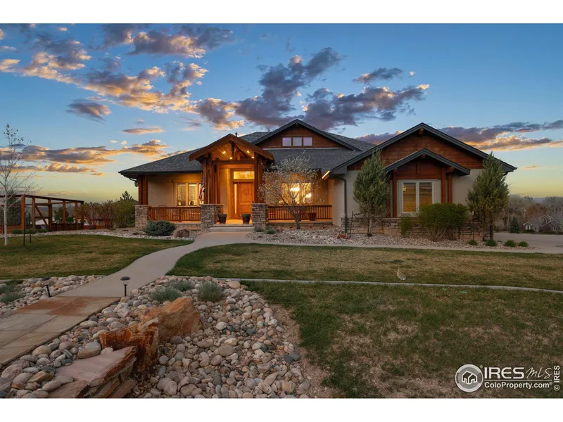 Nestled in the prestigious Commencement Ridge subdivision and set on an expansive 2.78-acre lot nestled against the foothills, this exquisite modern ranch home offers the perfect blend of luxury, craftsmanship, and natural beauty. With 5 spacious bedrooms, 4.5 baths, and a walkout basement, this rare gem is designed for both entertaining and peaceful everyday living. From the moment you step inside, you'll be captivated by the rich warmth of walnut hardwood floors and the rustic sophistication of knotty alder cabinetry, alder trim, and solid alder doors throughout the home. Every detail has been meticulously crafted to blend natural materials with modern comfort. Enjoy peaceful mornings on the covered front porch, coffee in hand as you take in the soft sounds of nature. In the evening, move to the covered back deck for a barbecue with friends or a quiet dinner under the stars, complete with the tranquil soundtrack of a bubbling rock water feature and panoramic views. Inside, you'll find 4 fireplaces, 2 inside and 2 outside, creating a warm and inviting atmosphere on every level. With newer carpet, 2 newer water heaters, and a chef's kitchen featuring slab granite, a gas range, and double ovens, along with the perfect study for anyone who works from home. And let's not forget the wet bar in the basement, plus the perfect ensuite for the overnight guest. Thoughtful landscaping with plenty of trees and an amazing garden setup. From luxury finishes to serene outdoor living, it offers an escape while still being just minutes from the conveniences of Loveland. If you're seeking a home that reflects your taste for quality, space, and peace, this is the one.