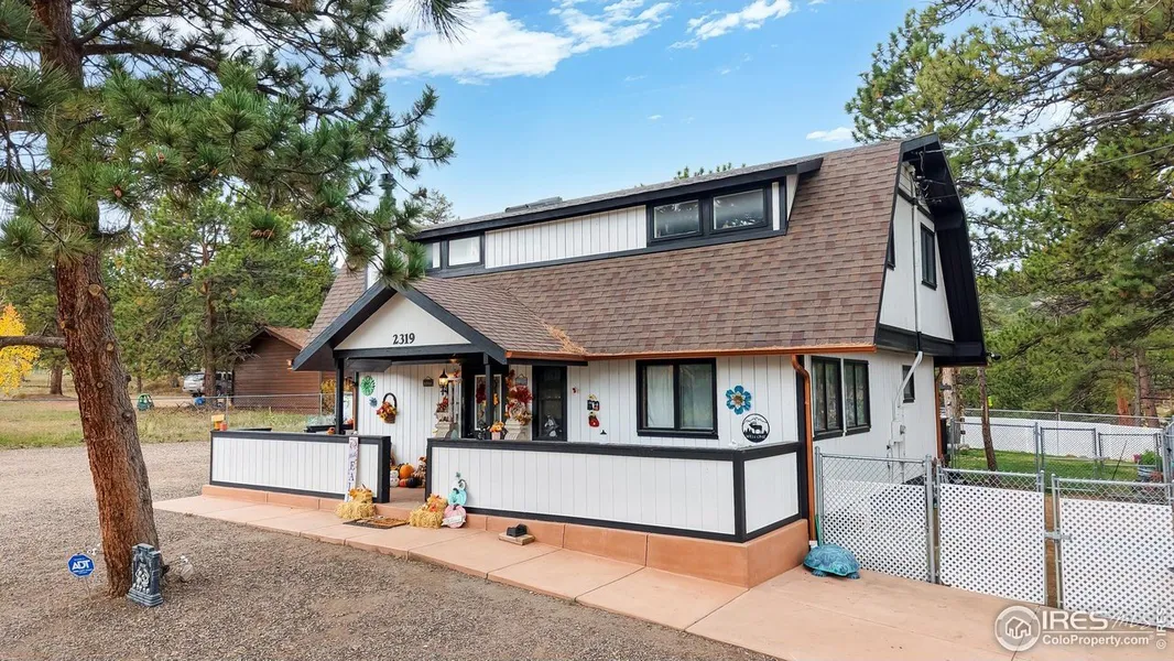 Horses allowed and property is bordered on the West by a seasonal stream. This 1-acre homestead-style property, perfectly situated with easy access to all Estes Park has to offer. This 4-bedroom, 2-bath home features a fully fenced backyard with chain link fencing, ideal for keeping little ones safe. The mini barn has been thoughtfully converted into a she-shed with running water and heat! A fully functional chicken coop is ready for your feathered friends, and the former horse pens, now adapted for "iron horses," still accommodate equestrian needs. The primary bedroom is a true retreat, complete with a built-in sauna, skylights, walk-in closets, and private access to an updated upper-level bath. Main-level vaulted ceilings with exposed wood beams create a warm, inviting atmosphere, and the natural gas fireplace adds cozy charm. Step out to the spacious back deck and take in the serene mountain trees and striking rock outcroppings. A circular driveway provides ample parking and room to add a garage. With a seasonal stream running through the property, this home offers a rare chance to live life fully in a beautiful setting. Don't miss the property video to truly appreciate everything this unique homestead has to offer.