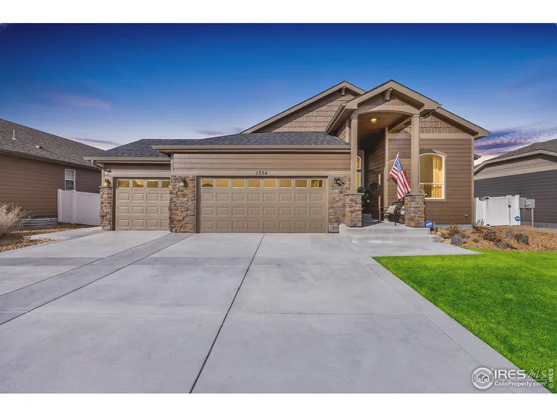 Welcome to 1324 Means Ln. in beautiful Berthoud, where mountain views meet the charm of small-town living. Pride of ownership is immediately evident, from the new Class 4 impact-resistant roof, to the fresh exterior paint and extensive flatwork along the south-facing driveway and side yard. A dramatic, soaring entryway sets the tone as you step inside, leading to a grand hallway accented by rich hardwood floors. Elegant French doors open to a flexible office or formal dining space. The main living area features vaulted ceilings, abundant natural light from oversized windows, and a cozy gas fireplace that anchors the space-perfect for gatherings and everyday living. The kitchen shines with gleaming new appliances, generous cabinetry, and granite countertops. Through graceful architectural arches, the primary suite becomes a true retreat, highlighted by vaulted ceilings and a stunning doub...