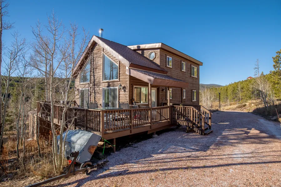 Welcome to your turnkey meticulously cared-for mountain retreat, a captivating three-bedroom, three-bathroom residence spread across multiple levels in the scenic haven of Red Feather Lakes. This thoughtfully designed home seamlessly marries aesthetics, privacy, and nature's embrace, providing an ideal sanctuary for those seeking a serene getaway.