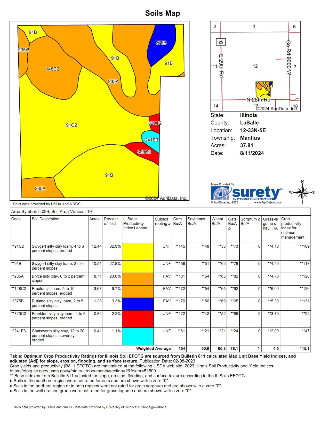 Search for detailed parcel information including; Elevation & Vegetation Maps, Ownership Information, Detailed Parcel Information, Crop History Map, Soil Survey Productivity Data, and more.