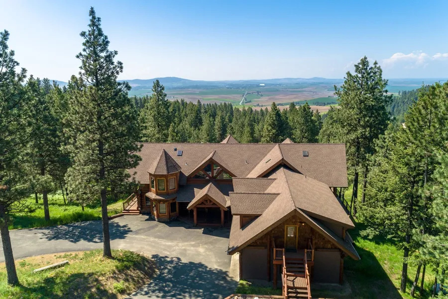 Welcome to the Log Castle. This luxury spectacular home is only 5.5 miles to Moscow. Custom built, architecturally stunning Log Home on 48 Acres with amazing views of Moscow. Nestled against the backdrop of the Western edge of Moscow Mountain. Thoughtfully detailed and craftsmanship finished including more than 20 different types of wood. Flexible 3 potential separate living quarters or 1 large family home with 3 kitchens, 9100 sq ft, 5 bed en-suites. Features in-floor heating for ultimate comfort. Each of the 5 en-suite bedrooms has its own unique view of the picturesque setting of North Idaho. Use as a home or a rental income investment. Truly a one of a kind special legacy property.