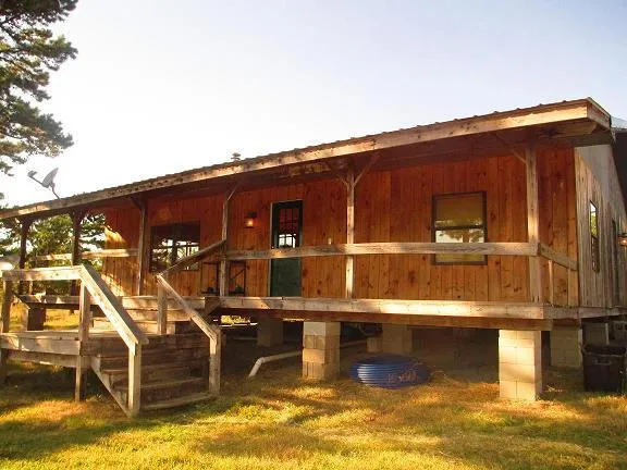 If you are looking for a semi secluded country home this is the one for you.The house is built from trees off the land.It sits on 8 mostly cleared acres with a pond.The water source is a well and cistern tank and has a septic.The living room and kitchen is an open design.There is propane heat although it is set up for a wood burning heater also.The interior has cedar board walls.The kitchen stove is included.
