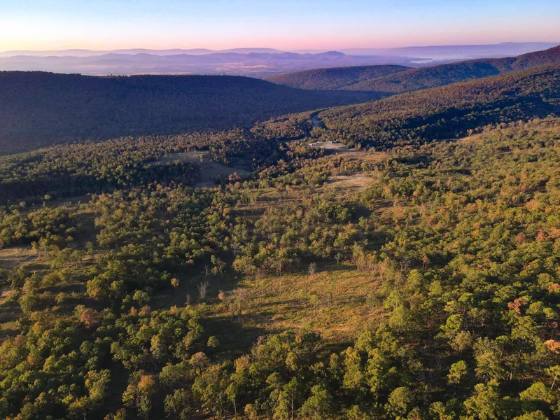 Description: A 445-acre hunting/recreational tract that sits on separate sides of a creek with differing elevations and numerous roads and trails stretching from hilltop to creek bottom and everywhere along the way. One small cabin with electricity and water sits atop a flat pad past the entrance of the property.