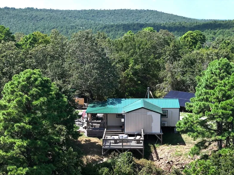 PEACE AND INDEPENDENCE This is a working homestead with established fruit trees, deep water well and its own power. Off Grid Property: Located just 6 miles north of the Wilburton Fire Dept. at the 1060 Rd. US 270, on a ridge of the San Bois Mountains of Southeast Oklahoma, This home is built where one can view out to the world from wherever you are working. The view is to the south enabling one to see most of the beautiful Ouachita Mountain system. A big-little mountain cabin with a covered porch and deck on 17 acres. One bedroom and a full bath, a nice open living room with a cute kitchen and beside the kitchen is the pantry with the utilities room. There are 12kw solar w/900 ah batteries, 30x48x12h steel welded shop with a 12' shed roof on its side. There is one 2100 gallon cistern for water back up and a tankless propane water heater supported by a 250 gallon propane tank. A 3 stage water filtration system with a 200' cased well with well house. 10x10 chicken run and coop, wood stove will heat 2000 sf, Tiled stand up shower with niche. A 42" tv in Armoire in living area, Household furniture stays (Bed, couch and chair, dinette set) In the laundry room are built in closets and dressers. The shop is all metal welded construction. Shop: all racks , shelving cabinets, and work benches stays. Over head hoist runs length of shop. Tote rack stays,Wall mounted wood storage rack stays. The heat is from the wood heater and propane heat if needed.