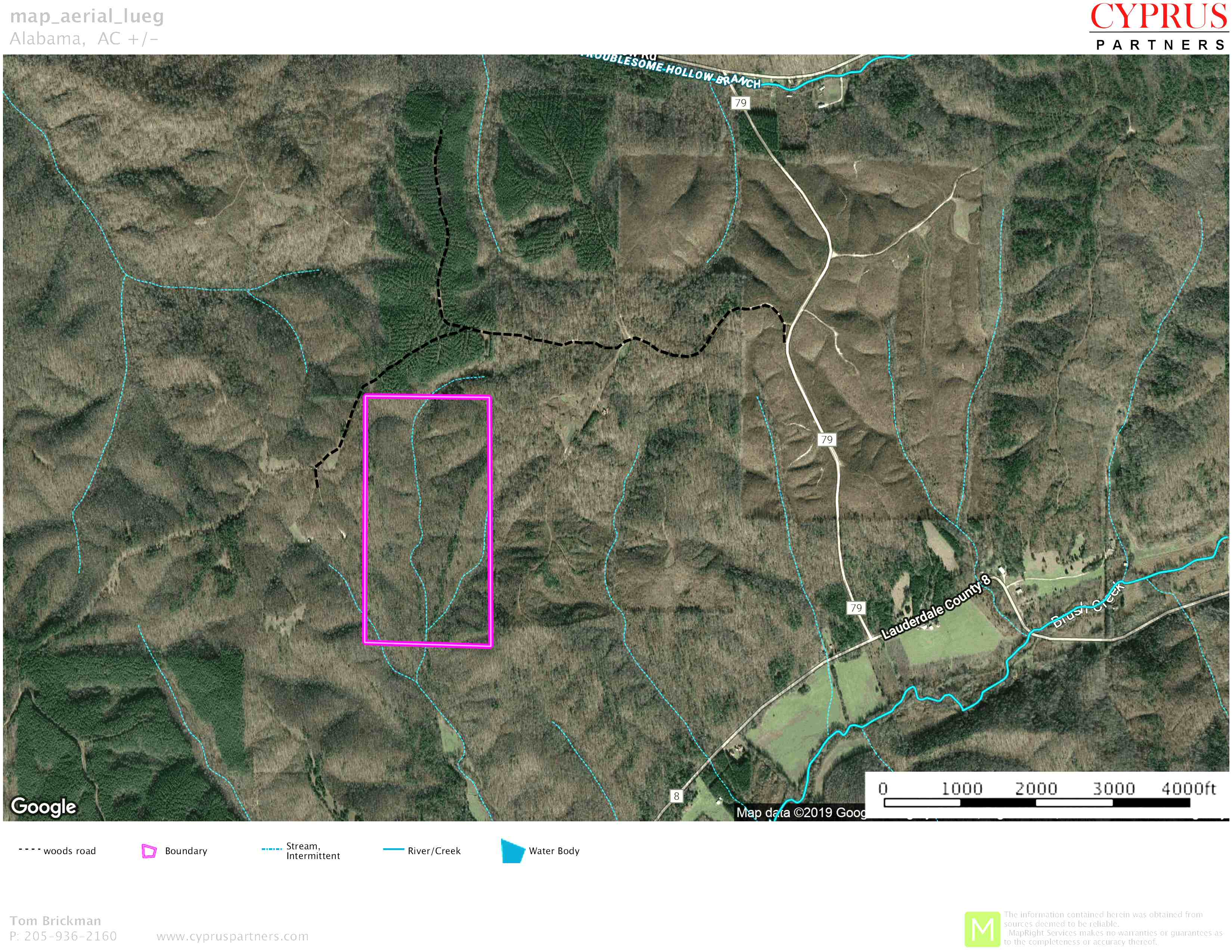 Take AL Hwy 20 northwest toward Savannah, TN for 19.4 miles. Take a left on to County Rd 8 and go 4.4 miles. Take a right on to County Rd 79 and go 0.6 miles to a dirt road on the left. Look for the Cyprus Partners sign. From here youll need a pickup truck with off-road tires and good clearance. Take a left on to the dirt road and go exactly 1.0 miles to the northwest corner of the property. Look for the Cyprus Partners sign. You are welcome to look on your own (there are no roads into the interior of the property, so from here to see the property youll have to walk using a hand compass and topo map/aerial for guidance). Download the brochure from the web site to get these maps and take them with you. Or, you can set up an appointment with the listing agent, Colin Bagwell, 256-527-4050. The northwest corner of the property is located at Lat: 34 57 44.6 N.; Lon: 87 58 38.2 W.