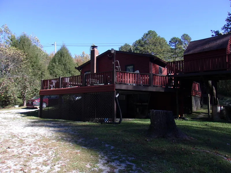 Lovely log cabin with log siding, built on 6.415 acres . The creek out back provides a cave like waterfall and is the most peaceful place ever to have your morning coffee either on the large deck or from the screened back porch. . The yard is big with a circular drive and metal car port. The roof is also metal There is city water and a well . Both are piped into the house. There is a generator, gas logs and buck stove plus central heat and air. This place is ready for all weather events. The house upstairs has hardwood in most areas and tile, 2 bed rooms 1 full bath formal living and dining as well as a charming eat in kitchen . The family room has a masonry fireplace with gas logs.Cozy up . Heading down stairs you will find a lift on the stairs for those bad knees, but down there you will find 2 bed rooms, 1 full bath, living room with buck stove and kitchen dining area. . In law suite of adult kids love this. The flooring down stairs is carpet and tile. Loads of storage. Appliances up and down stay. not the freeze or the big washer and dryer.To nice to miss out on.