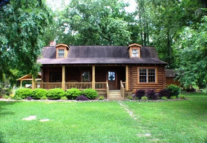 TRANQUILITY FOUND in this fabulous location just outside the city, 2.6 acres, and beautifully maintained log cabin home with 4 bedrooms, 3.5 baths, some updates,, unbelievable screened porch, front porch, 2 outbuildings, and part of stocked pond. Master has 2 bathrooms, and there is pine flooring throughout (even under upstairs carpet). Cypress exterior, newer appliances, huge walk-in pantry, double ovens. Home is located on gated private road, is very secluded. Possible opportunity to purchase additional log home. Paradise found!
