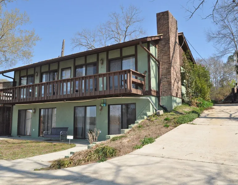 Welcome to the lake! This lakehome sits in a small quiet cove that looks across the water at nature only, past beautiful reflections of the all-nature headlands, & out to bigger water for pretty lake views. Every lakeside room has slider doors to enjoy the privacy, fresh air & view. Lots of open parking & a big covered concrete patio greet you at this freshly painted 3 bedrm/3 bath 2-level lakehouse. Beveled glass front door. Eat-in Kitchen w/ double-bowl stainless sink, breakfast bar, DW, smoothtop stove, icemaker fridge & extra window A/C unit if you don't feel like running the central air system. Vaulted & beamed LR has wide plank pine flooring, brick hearth w/ buck stove & sliders to the lakeside verandah. Open plan Master & Bath (17x11), is also vaulted & beamed, w/ wide plank flooring, has sliders to the verandah, & features a fully loaded jetted tub. Bedrm 2 on the main floor is s...