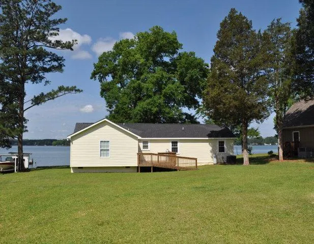 Hard-to-find one-level lake home on a level parcel, with fabulous Big, Big Water View! Make this 4/3 lakefront your full-time residence or your escape to lake paradise. Open plan layout makes this home feel comfortable. 12x12 Deck streetside has a ramp instead of stairs to make entry easy for everyone. Enter the home into a little foyer and turn rt. into the open living area that combines the Kitchen and Family Rm so everyone can enjoy the lake view. Portable propane runs the gas heater fireplace in the LR that takes the chilly edge off nicely in the winter & there's a spare tank to swap out. Kitchen has Whirlpool stainless-style appliances (because you like your magnets!) including smooth-top stove, microwave, DW, fridge. Open the blinds for that breathtaking view! The LR opens to a big Back Deck that has plenty of room for BBQing, relaxing & a long built-in bench for entertaining at your lakehouse. Master Suite offers a comfortably-sized room at 14x14 w/ a Walk-in Closet, Master Bath w/ connections for stackable W/D, and its own Sunroom! This 18-ft. long room has screened insulated windows all around so you can let in the breeze. It could be a private Owners Retreat, an Exercise Room, an office- so many options & with a fabulous lake view & its own private exit to the lakeside deck. Bedrm 2 is 13.25x12 and has immediate access thru a pocket door to the home's 2nd Bath that has a rectangular step-in shower. Bedrm 3 is 9.5x9.5 but the Seller has managed to fit a king-sized bed in there. You might like it! It faces lakeside & has that awesome lake vista. Bedrm 4 is 11.67x9.5- big enough for one big or two small beds. Great lakeside! Very nice covered boat slip/dock & concrete retaining wall w/ steps into water- all new in 2013. A magnificent tree provides the perfect shady spot for your picnic table & you've gotta' love the red swing! Original SITE-BUILT home believed to have been built in the 1960s, but Seller has spent the past several years updating, expanding & improving this lake home making it better & better- new 30-year roof, new HVAC, all new plumbing & electric, & new water heater in 2010. All new doors & windows 2010-2012 including insulated storm doors to let in more light. Full vapor barrier under home & termite prevention treatment in 2009. New insulation under home, in attic & exterior walls under the siding in 2011. TWO NEW Bedrooms w/ Walk-in Closets and TWO NEW Baths added to this home in 2011. In 2012, new floating & padded wood laminate flooring was put thru' out the home to help even out flooring and make it all super easy-care/easy-clean. New lakeside deck in 2012 with covered entry, new street side entry deck in 2013. New septic drain field in 2013. The electric was put underground & a new well pump added in 2014. The Kitchen finished out in 2015. BUY WITH CONFIDENCE- Seller is offering 1-Yr Home Warranty! Some furnishings may be negotiable. Older outbuilding with mini-carport has 110amp power- still good for storage or workshop. If you DON'T want a multiple level home w/ stairs, or hills, or HOA fees, you are going to love this place! Casual, clean, unrestricted neighborhood near Skippers Landing- restaurant & boat gas/ramp. Boats and golf cart available for sale via separate bill of sale, but not before house sells. And YES- BIG, BIG WATER. Wow- what a view! LOVE YOUR LAKE LIFE!