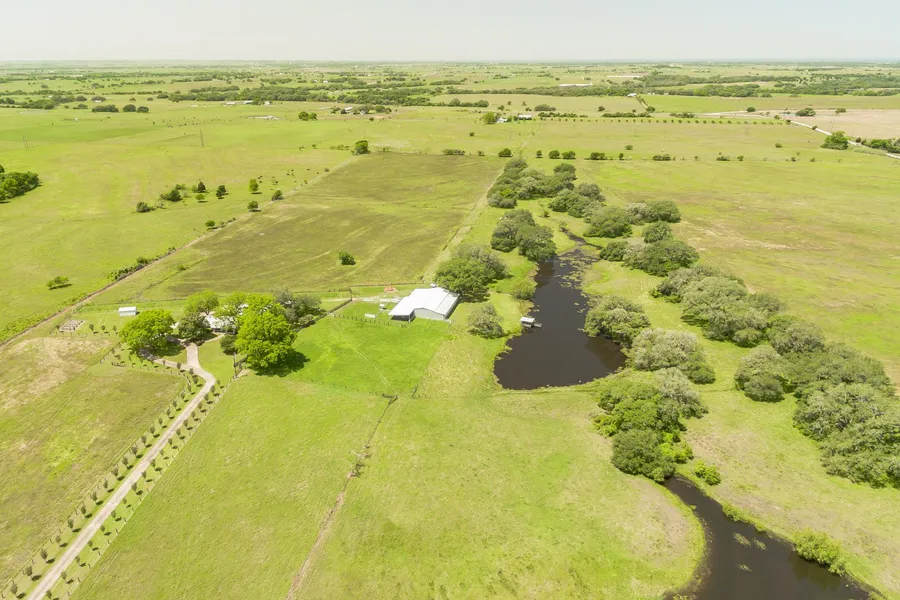 This gently rolling 80.28 acre partially wooded ranch has a beautiful view of the surrounding countryside. Great care has been given for improvement to the land. The property is fenced and cross fenced. Ranch is equipped to handle cattle and hay production, as it features 10 cross fenced (5-8 strands with gated entrances) improved pastures, a lake ( approximately 150ft X 450ft per owner) , & two smaller ponds. The large metal barn has a concrete slab (30X40 per owner) and property has an estimate of a total 5,800 sq. ft. shed and barn space.(per LCAD), working pens, feed storage accessible by 8 sliding doors, all the room you need to manage the property. The lake , with a pier provides fishing and water for the game that inhabit the area. Nice Square shaped property has Road frontage on two sides, includes: 1779 ft. of road frontage along the east front entrance, FM 263 and 1999 ft. along the North boundary, FM 256 per LCAD. Electrical fence around entire property.