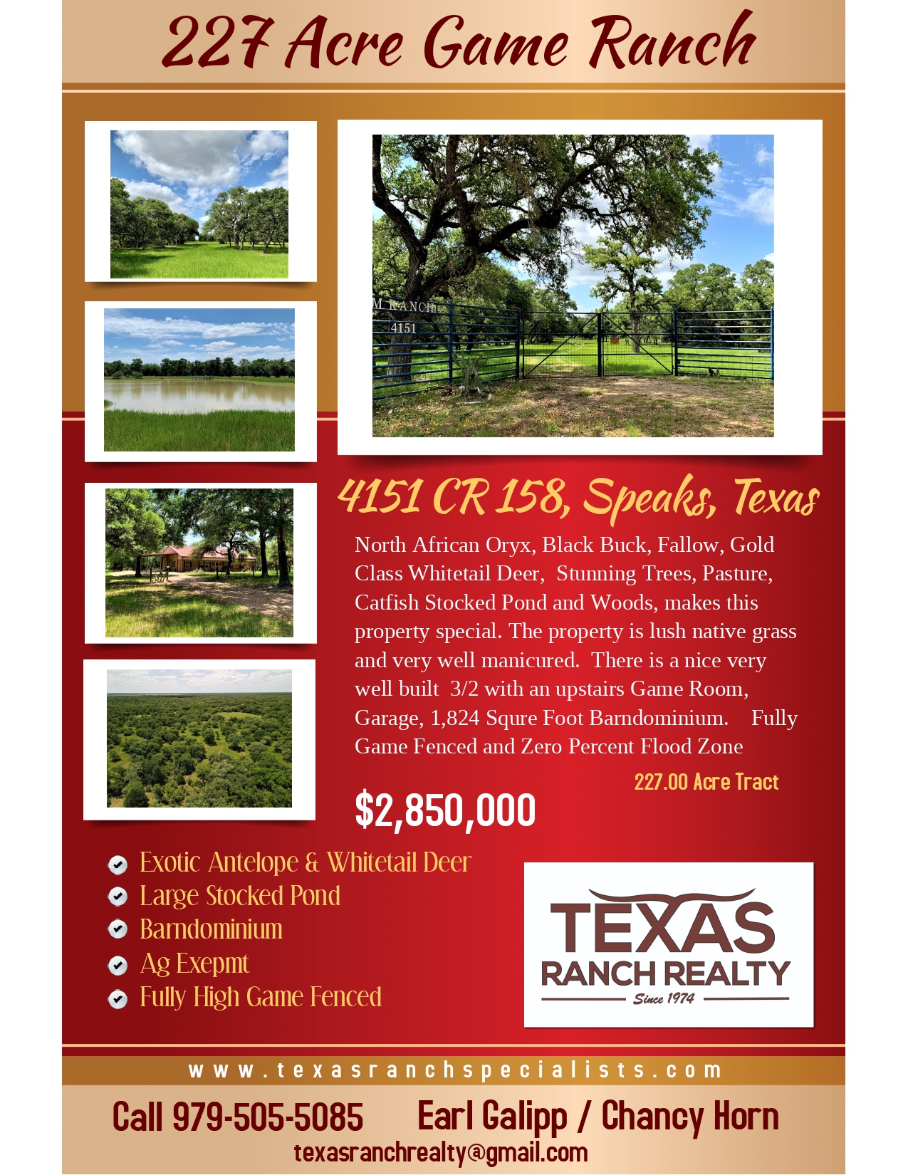 DESCRIPTION - This beautiful Fully High Fenced Hunting tract with Lush Native Grass and Native Trees is ready for Duck and Deer Hunting with a Primitive Newer Barndominium. 20 +/- North African Oryx Antelope with Newborns, 12 +/- Black Buck, and unknown Large Amount of Whitetail Deer with Record Racks (Gold Class) 44 Plus with B&C ranging from 160 to 200 plus and several pet Fallow Deer which you can feed corn from your hands to them. The ranch is currently Hunting Leased by Four Guns and Special Hunts. It has an Elevation Change of...