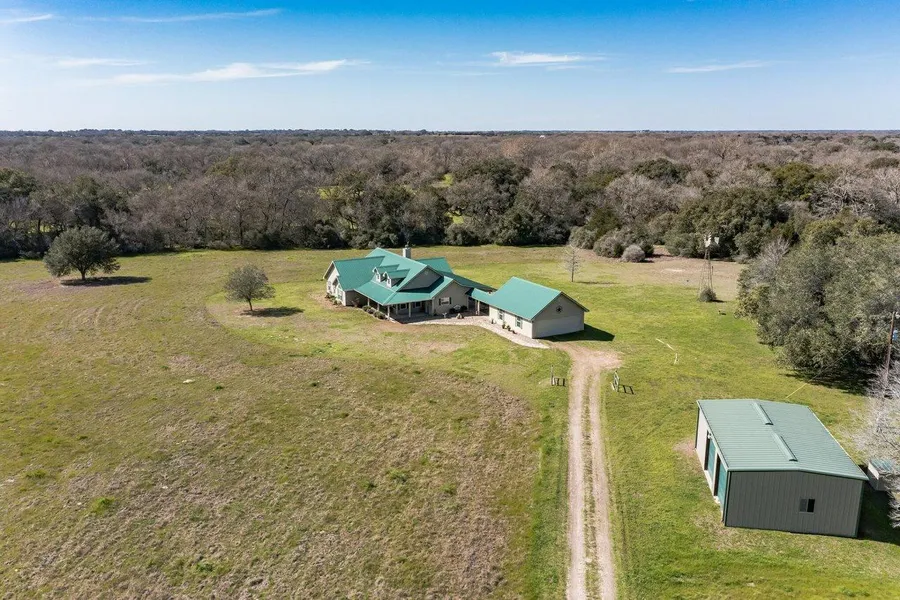This 18-year-old custom-built home is located almost equidistant between San Antonio, Houston, and Austin. Sitting on the back of approximately 14 meadowed acres near a seasonal creek, this ~ 2500 sf (per CAD) pristine home has oversized rooms and countless windows in every room to ensure maximum sunlight. The house's placement was carefully chosen to omit morning and evening glare while allowing optimal viewing of all wildlife. The home boasts a hardy plank exterior and tile and laminate floor interior, requiring minimum maintenance. The detached garage is larger than normal and equipped with a full bathroom. The tractor, shredder, mower, ladders, & tools, all have ample space in the ~ 840 sf shop built in 2010. Covered porches/patio adorn the front and back of the home with several entryways. The home also has ample storage, including eleven closets! To recoup some of your investment...