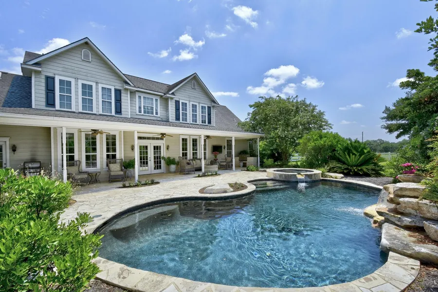 Country LUXURY LIVING centrally located to Austin, Houston, San Antonio and Victoria. Circle drive welcomes you to the 3,275 SF two-story 3BD/3.5BA stone main house with 2 car garage which features study, formal dining room, family room with gorgeous gas fireplace and open floorplan overlooking the breakfast area and kitchen with upgraded appliances and gigantic granite counter top. Expansive master en suite, separate from other bedrooms, boast walk-in closet, large jacuzzi tub and spacious shower. There are 2 additional large bedrooms located on the 2nd floor, 2 baths, and media room which can be converted into a 3rd bedroom. HUGE covered patio w/2 entertainment areas, large outdoor kitchen and breathtaking views of the resort style pool and manicured lawn. BONUS 700 SF GUEST HOUSE could be used as mother-in-law ensuite or generate additional income. 4BD/1BA with kitchen and family room. Guest House also includes a separate work room, storage unit and garage for riding mower. Why wait, make this your DREAM HOME!