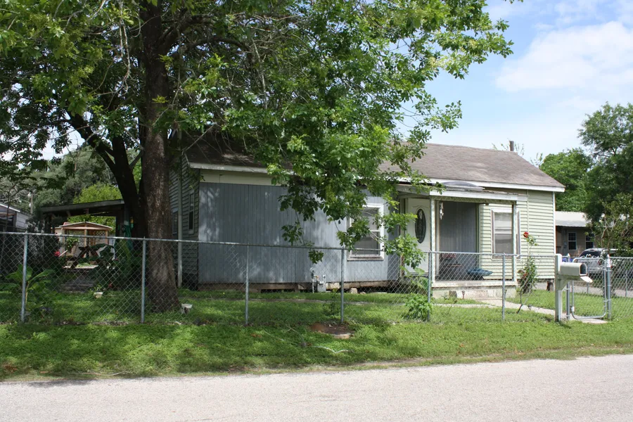 Corner lot with three bedroom, two bath home, two living areas, kitchen with dining area.