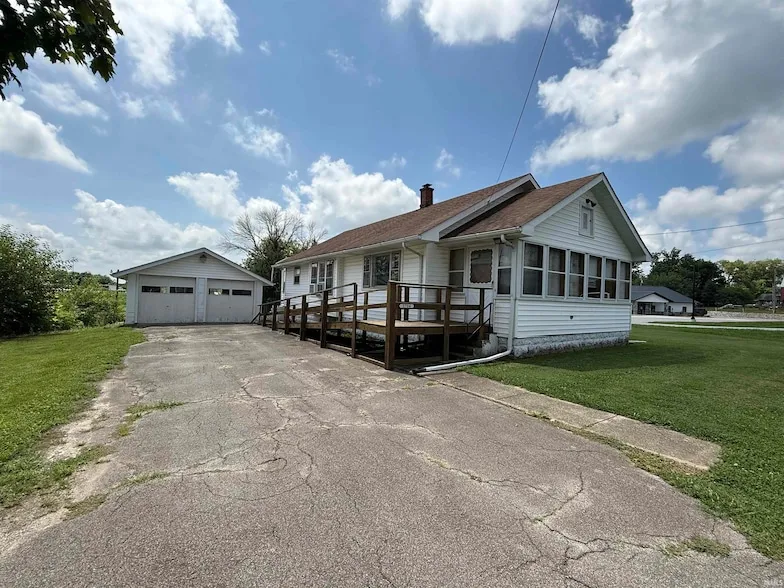 This property offers a well-maintained home featuring three bedrooms and one full bathroom, along with a detached two-car garage. A spacious 30' x 28' outbuilding with garage doors provides additional storage or workshop space. The home includes an unfinished basement and is situated on approximately one acre of land, offering ample outdoor space. The interior includes a large enclosed front porch accessible from the living room, providing a welcoming entry and additional living space. Each bedroom is carpeted and features a ceiling fan, closet, and one is enhanced with an electric fireplace. The bathroom includes a tub/shower combination. A separate dining area is located just off the kitchen, which also features an eat-in area and convenient access to the side of the home near the detached garage. Main-level laundry is available, with direct access to the basement.
