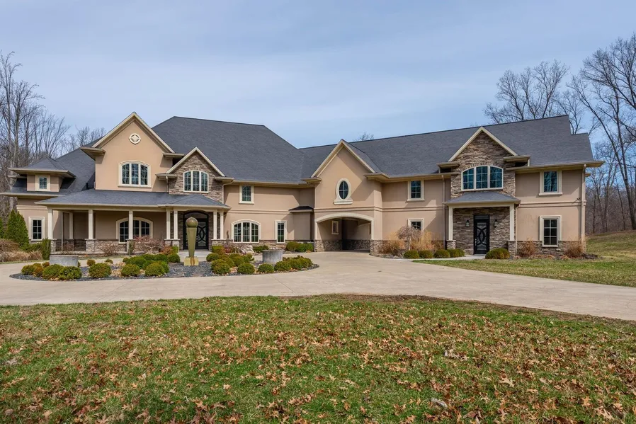 Nestled on nearly 7 acres of Southern Indiana forest located on the north side of Lawrence County, sits this immaculate custom-built lifestyle property featuring nearly 11,000 sq ft of living space, indoor and outdoor entertaining zones to please the most discerning of hosts, and just 70 minutes to the Indianapolis airport. This is an estate that offers seclusion, privacy, and room to roam, yet easy access to shopping, highways, Lake Monroe, IU sports facilities, and Indianapolis. The main floor of the home boasts front to back views, bright, open, and sunny spaces, two living areas, both with gas fireplaces, an exceedingly well designed chef's kitchen with multiple prep zones, induction cooktop, ice chest, wine chiller, double wall ovens, drawer microwave, quartz countertops, and so much more. The main floor primary suite is over 1200 sq ft and walks out onto a private covered patio overlooking the pool area. The opulent ensuite bathroom features radiant heated floor tile, two large walk-in closets, one with a built-in safe, double vanity with LED mirrors, soaking tub, and large walk-in shower. Upstairs you will find 4 additional suites, each with their own surprise details, a large room currently used as a play room that would be a great additional home office or fitness room, a second floor laundry room, and entry into the home theater with amphitheater seating, and impressive game room beyond.