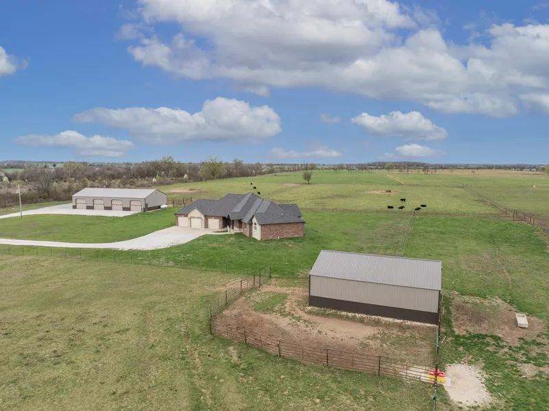 Enjoy peaceful country living on 80 acres with this custom-designed, all-brick home featuring stone accents & a gated entry off a paved county road. This 3 BR, 2.5 BA split floorplan includes a Formal Dining Room, dedicated Office/Bonus Rm and a Sunroom with cathedral ceiling, gas log fireplace & pasture views. The spacious Living Room boasts a beamed cathedral ceiling & stone fireplace flanked by built-in cabinets. The class-act Kitchen showcases granite countertops, alder cabinets, a large island, GE Smart Caf appliances (including a fridge with built-in Keurig), a Wolf 6-burner propane cooktop + a walk-in Pantryplus thoughtful extras like a wine/beverage cooler, mixer lift, pull-out pot rack drawers & hidden storage. The luxurious Master Suite features a scalloped tray ceiling with ambient lighting, large Bath with granite double vanities, corner tub, large walk-in shower & an oversized custom closet. Two additional bedrooms share a full bath on the opposite wing. Additional highlights include engineered hardwood, LVP, tile & carpet throughout; a screened-in back porch; a bonus family friendly entry with hall tree, Laundry Rm, Half Bath & access to the oversized, insulated, heated/cooled 3-car Garage with utility sink, Mechanical Room & reinforced Storm Room with a bonus automatic electric dog door. The newer metal 40 x 80 Shop with 12' sidewall's features concrete floors, a total of 6 overhead doors (4 being 12'x10'), a floor drain and all LED lighting. The 30 x 40 newer Pole Building with LED lighting is currently utilized as a Horse Barn surrounded by horse paddocks with high Tensile fencing. The open fertile pastures are fenced and cross-fenced with a combination of 6-strand barbed and smooth wire for all classes of livestock. 2 Ponds, 1 being spring fed. A wet weather creek in addition to being serviced by 5 different frost-free waterers insures ample water supply. The permanent pipe corral system allows for easy processing with low labor inputs.