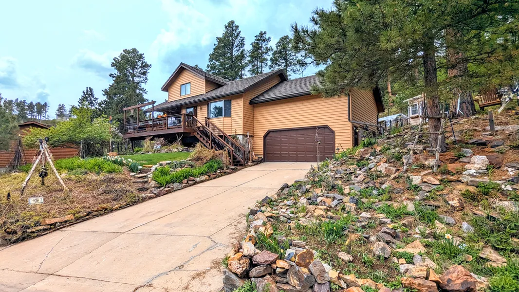 Majestic landscaping and forested ambiance imbue this 3 bed, 2 bath home in the Mountain View subdivision in Lead. This home can come TURN-KEY fully furnished with newer couches and loungers, less personal effects! Very nice newer front deck has with forested front view. Back deck is adorned with forested views and plant life growing all around. Inside the home, a vaulted ceiling adorns the main living room, bay window overlooking the front of home, main floor also has a walkout to the back deck overlooking the majestic gardens adorning the back of the property. Remodeled kitchen has corian counters. This home has forced air natural gas with central air conditioning. There are metal shake shingles with transferrable warranty and a combination of wood and vinyl siding. Upper level is a master bedroom suite with a full bathroom. Basement currently has a large groovy game room, laundry, storage/office (no egress), and walkout to the garage. The home has a 2 car garage with workbench. The back deck also has hottub and gas hookups. This is a stellar home in a prime area of Lead. Contact Matt Klein 605 -920-1341 with Century 21 Associated Realty, Inc. for showings and more information.