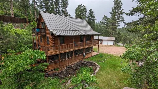 Great outdoor views adorn this log home near HWY 14A, just outside of Lead and near the Terry Peak turnoff. Mickelson Trail runs right above the home and across the highway. Neat views from the perched deck, overlooking the surrounding hills and trails. Covered deck entry on on the ground level opens to a mud room with laundry access. This log home is a 4 bed, 3 bathroom home with amazing wood floors adorning much of the main and upper levels. Remodeled kitchen has granite counters, newer appliances, open concept to the dining and living area. Iconic wood beam accents adorn the main floor - the living room has open vaulted ceiling that looks up to the loft and primary bedroom. Upper level has primary bedroom with a full bathroom - balcony access from the primary bedroom looks over the exterior living space. The upper level has a loft lounge area. The home has a spacious driveway and a detached 2 car garage, which has a game room or storage area with wood burning fireplace. Basement has been recently remodeled and has a game room, a single bedroom (both with walkout access), and a 3/4 bathroom. Home and garage had new 24 gauge standing seam metal roofing with ice guard installed in 2020. Small section of property located across the highway adjoins Mickelson Trail. Don't miss out on this highly unique log home off the Highway with Mickelson Trail just a stone's throw away. Contact Matt Klein 605-920-1341 with Century 21 Associated Realty, Inc for showings and more information.