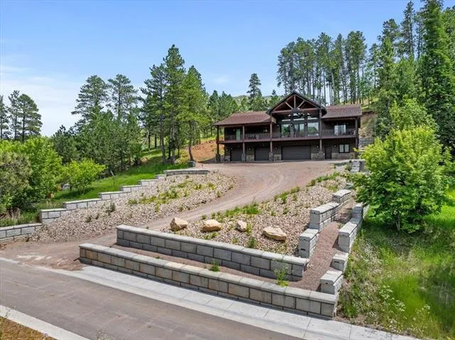 Call listing agent Linda Derosier at 605-580-1078 to view this luxurious one-of-a-kind custom home overlooking a spectacular view of the Brown Rocks of Deadwood. The lower level offers an oversized 3-car garage, completely finished with a beautiful hardwood ceiling, epoxy-coated flooring, and in-floor heating throughout. Let the corks flow with a temperature-controlled wine cellar, workshop, mechanical room, and plenty of storage. The lower level has a bedroom/office and full bathroom. Now, on to the main level in the elevator or staircase with a custom-designed hand railing. The massive great room features vaulted ceilings, a cozy gas fireplace, and a custom-designed kitchen. The kitchen, an entertainer’s dream, features a massive island with a 6-burner gas stove, 2 wall ovens, 2 dishwashers, top-of-the-line appliances, and large pantry. Enjoy a fabulous view from the enormous covered d...