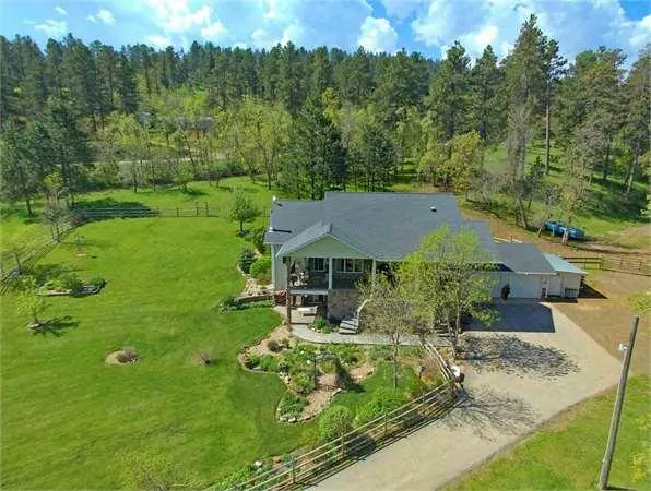 Stunning and Creative property including gorgeous views and beautiful Black Hills Sunrises. This two level home offers uniqueness in design including a Beautiful Stone gas fireplace in living area, open concept with living, dining and kitchen area with roomy center island, full Extension cabinets with pullout spice cabinets. This quality home also includes an open study on main level, large master with expansive master bath. laundry room with pocket door, Two patios -main and lower level, a designed Cement patio-and large covered front deck, all maintenance free, heated floor in walkout lower level with 3 bedrooms and 1 bath, 2nd gas fireplace and a woodburner stove, includes a new natural gas forced air furnace with humidifier, new central air conditioner, and on demand water heater!! This quality designed home has 2nd kitchen with open living area in lower level-perfect for rental or M-IN-Law apt and currently used as vacation rental with enclosed study/office. Handicap friendly with no steps to lower level. Fully fenced deer proofed yard. Horse property with automatic heated waterer, shed, tack room and fenced in corrals. Built with requested top quality construction. Two car attached heated garage. Mature oak, ash, elm trees maintain the private and serene atmosphere as nestled in the valley protected from the elements!