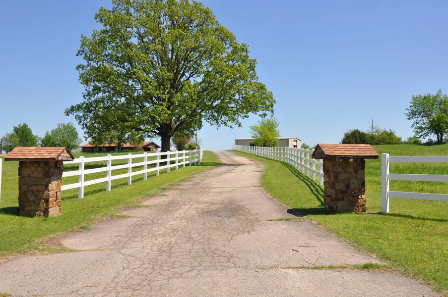 LOCATION: 110 Trayce St. in the city of Poteau. This address is at the SE edge of the city of Poteau atop a hill overlooking Poteau River Valley to the East with Sugar Loaf and Poteau Mountains just a few miles across the valley. To the West just 2 miles is Cavanal Mountain which is adjacent to our city on its West side. Trayce St. dead-ends at the West edge of the 10 acres. From that point a 600 ft paved private driveway bounded on each side by white ranch fencing affords access to the home and shop building/ located atop the hill.