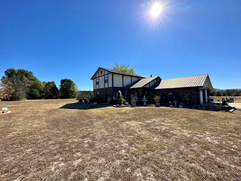 HOME: According to county records this home is 2838 square feet in size, and situated on the front 1/3 of 30 beautiful acres with amazing views to Sugarloaf Mountain to the east and Cavanal Hill to the west. Covered front porch and concrete with brick inlays wrap around from the front of the home to the huge back patio. Great locations for watching sunrises and sunsets for having morning coffee or outdoor cooking and entertaining. 4 bedrooms, 2.5 bathrooms, sunroom, craft room, living area, formal dining, laundry, powder room, pantry, two car garage, brick home with metal roof. Custom cabinets throughout the house, large ceramic tile floor, luxury laminate, waterproof vinyl in the craft room , authentic hardwood flooring upstairs. Beautiful custom concrete counter tops, every room could make a page full of pinterest ideas, very classy and tastefully done personal touches and finishes throughout the entire home. Lots of stage closets, mechanical room that is perfect for holiday decorations This home is a show stopper when you pull in the drive and even more so when you walk inside. The kitchen has center island with tons of countertop space for preparing large meals and entertaining of guest. Electric heat, but also has a forced air wood burning stove that is very efficient. Tons of landscaping and flower beds.