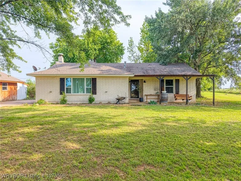This property spans 17.13 acres of level land, fully fenced and designated as pasture. It features a stocked pond suitable for fishing and livestock. The brick home boasts 2,161 heated square feet, layout includes an open concept living, kitchen, and dining area, a cozy sitting area, an office, four bedrooms, two bathrooms, and a utility room. The living room showcases wood-look laminate flooring & a natural stone gas log fireplace with a raised hearth and wooden mantle. The dining area features white paneled wainscoting with windows above and a built-in seat beneath. The kitchen is equipped with white cabinets, eating bar, epoxy white countertops (updated in Nov 2024) with glass tile backsplash, & a farmhouse sink with a window above. Stainless steel appliances including a dishwasher, gas cooktop with a vent hood, wall oven & microwave. The sitting area continues with wood-look laminate flooring and includes a large picture window and a door that opens to a side concrete patio. The office has decorative flooring, while the bedrooms feature concrete floors. The hall bathroom includes a tub-shower combination with decorative flooring. The primary bedroom also has concrete flooring and glass doors leading to the back flagstone rock patio. The primary bathroom features a ceramic tile floor, double vanities with mirrors, a walk-in tiled shower with a seat, & a walk-in closet. Some updates include hot water tank, new paint, updated counter tops, & concrete slab. Additional features include a detached garage with electricity on a slab, 3 buildings each equipped with its own electricity (2 having septic), a small barn with a two-bay attached chicken coop. Located just minutes from Poteau, the property offers stunning views of Sugarloaf Mountain & Cavanal Hill. Fort Smith, Arkansas, is approximately 25 miles away. Nearby attractions include Talimena Drive, Ouachita National Forest, and Cedar Lake Equestrian Trails.