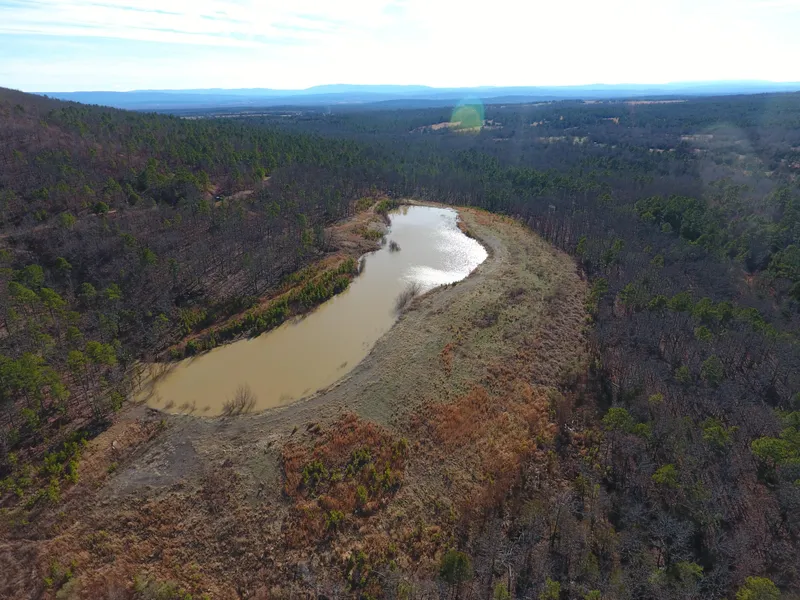 LAND: 307 acres m-l, which is mostly all wooded with various types of hardwoods native to this area such as post oak, red oak, blackjack oak, hickory, persimmon, red cedar and others including native shortleaf yellow pine. About the center of this land along its Easterly boundary line is a hilltop plateau consisting of approximately 15 acres of mostly level land that provides a panoramic view of the mountains and valleys below. The owner has cleared off about a 10 acre wildlife food plot on this flat plateau area. From its highest point the land slopes in an Westerly direction with an estimated variation in elevation from the lowest to highest point of about 400 feet so the slopes are consistent but gently in degree. The Westerly 40 acres or so is relatively level with very minor sloping. This location is about 2.5 miles from the country road which runs in the valley below the hill. The property fronts for about 1/2 mile along a private gas company road which forms the Northerly boundary line of this property. The landowner has constructed several ATV roads across the property to make it easy to retrieve game and access several hunting blinds and tree stands located on the property. The property is accessed by a well-maintained road and affords good access in all weather conditions. A locked gate prevents public access to this property at the present time.