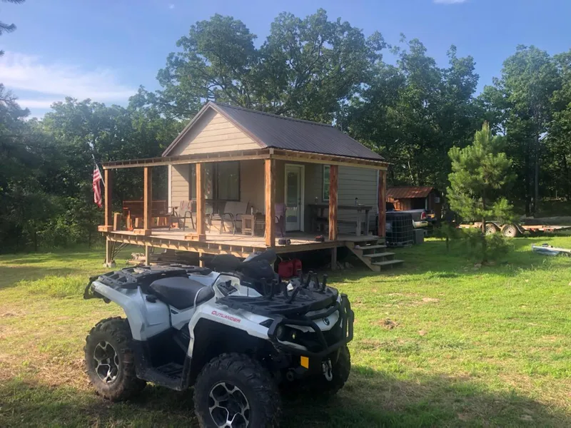 This is a beautiful parcel accessed parallel to an old railroad line that is only about 6 miles North of Talihina and then 4.5 miles up on top of a hill approx 2,000 ft above sea level that has good reception and had a cool breeze as cabin faces SE with a view of the kiamichi wilderness. The bunk house is 8 x 10 and will sleep 2 and includes a rainwater collection system, metal roof, window ac unit and a 6 ft. front porch and was built about 2017. The cabin is only 2 years old and is 320 sq. ft (16 by 20), open concept with a loft and could easily sleep 4 comfortablly. It has a full bath, water collection system, 100 watt solar panel and inverter. Cabin is made of piney knot wood and fiber cement siding. It has a co2 monitor, propane heater, instant hot water and a wraparound porch in the fromt and on one side. Lots of wildlife and atv trails and beautiful creek crossings where old handm...