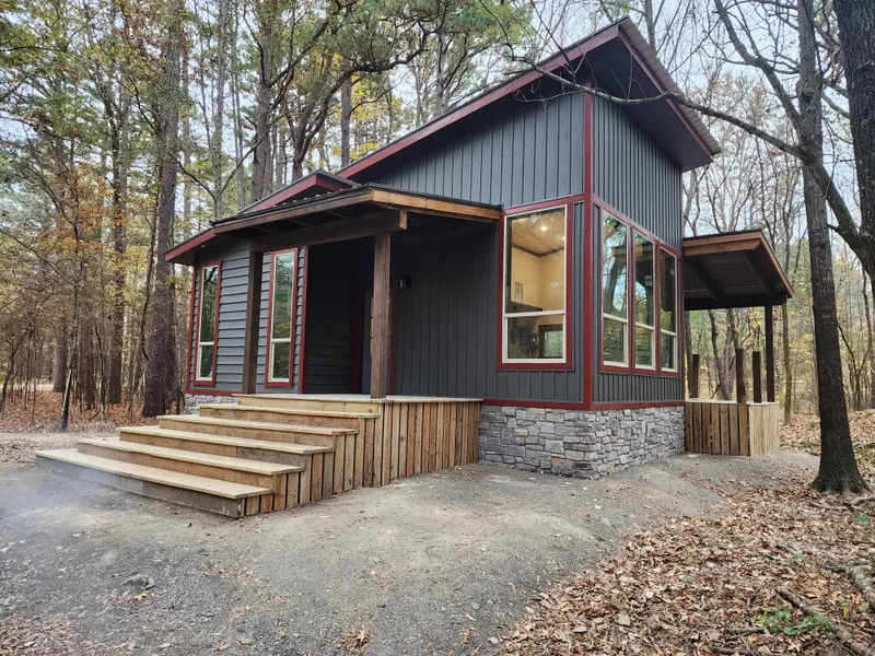 Cabin: The cabin is new construction and includes approximately 700 square feet of heated and cooled living space with 1 bedroom, 1 bathroom, large kitchen/living room and covered porches. The exterior of the cabin was designed with a virtually maintenance free exterior with vinyl board and batten siding, rock wainscoting, covered porches, composite shingle roof and vinyl siding in the soffit areas. Additionally, the cabin was designed to be very energy efficient to minimize heating and cooling costs with spray foam insulation, vinyl double pain windows with Low-E glass and Argon gas and on demand tankless hot water heater. The interior of the cabin was finished out with a combination of textured sheetrock and rustic tongue and groove white pine, water proof vinyl plank flooring, knotty pine interior doors and custom made cabinetry with leather finished granite counter tops. The level of craftsmanship, attention to detail and quality trim work throughout is very impressive.