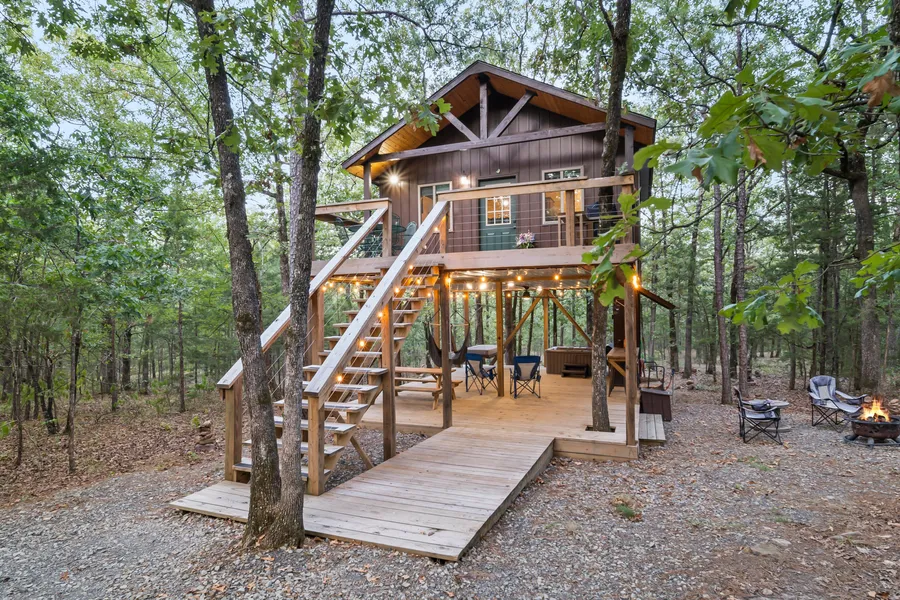 Big Cedar Wilderness Cabins three years of operation has generated over 435 five star reviews and well over $100,000 in annual gross revenue throughout four distinct Oklahoma seasons. The luxuriously appointed Cardinal and Bluebird Treehouses are uniquely placed on 5 acres and secluded in a pine and hardwood forest. Great care was taken to ensure privacy for each cabin which provides unparalleled treetop views with wrap around porches. Step inside and you have vaulted ceilings, an open concept featuring a king bed, queen sleeper sofa, flat screen tv, full kitchen and a spa inspired bathroom with soaking tub and separate shower. The upper deck has a gas grill and space for outdoor dining. The lower deck is perfectly outfitted with a swinging bed, suspended hammock chairs, hot tub and fire pit.