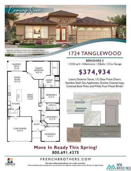 Luxury exterior stone, 1/2 glass front doors, stainless steel gas appliances, granite countertops, covered back patio, and white faux blinds.