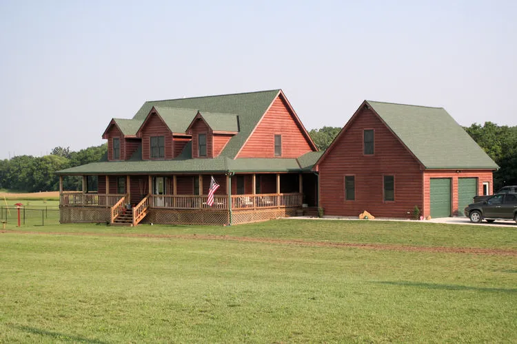 DRASTIC PRICE REDUCTION. Over $175,000 worth of upgrades. Gorgeous stream side location, w/ beautiful timber & a well cared for Canadian Pine sided 1.5 story home, open, bright, & beautifully landscaped, w/ natural stone, includes heated workshop, raised decks, large patio, rec room & much more on 7.25 wooded acres. Wrap around covered porch on 3 sides,huge patio just outside the double sliding doors of & entertainers dream,walk out basement.Kit features custom cherry cabinets, 6 seat island.Finished area over garage is the 4th bedroom. Price BELOW appraisal value. Located only 15 min from Leavenworth & 10 min to Tonganoxie.