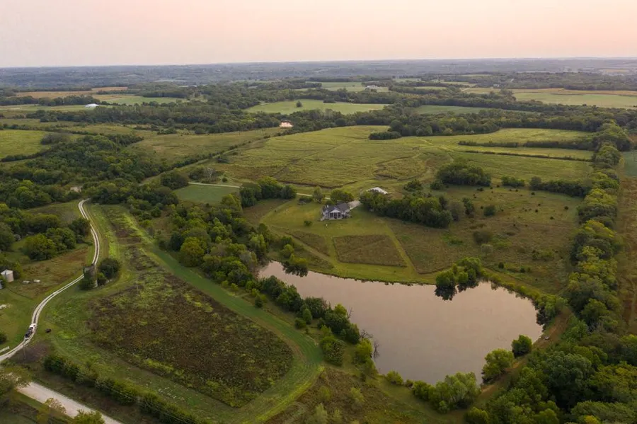 This is the home you've dreamed about! A rare offering for the open-market, this stunning home on acreage in Leavenworth County will blow you away when you see it. When you pull into the property, a half-mile gravel drive winds you through the woods and takes you to the setting of this gorgeous property. The home boasts a massive yard in the front and back, and sits on a hill overlooking the 3 acre pond, that's stocked full of fish. A custom 3,541 square foot home, built in 2004, with 3 bedrooms and 2.5 bathrooms upstairs, 2 additional non-conforming bedrooms and 1 full bath downstairs, with an oversized office and living room downstairs in a very spacious and newly finished walkout basement. The living room has a wood burning fireplace and a spacious open floor plan throughout the main floor. The master suite features his and her closets, a beautiful bathroom with dual vanity, large jacuzzi tub, and a large walk-in shower. The laundry is on the main floor, which is a plus. The property has 2 outbuildings, a 40'x60' with concrete floors, electricity, water, and a super cute finished out guest space. The second outbuilding is a 40'x50' with gravel floor, huge sliding doors on the front, with electricity. The pond is a key feature to the place, with over 3 surface acres of water, 17 feet deep +/- in the middle, and stocked full of trophy bass. The 79 acres was previously expired CRP, with very rich soils, the landowner has meticulously managed the property for giant whitetails, turkey, and a very healthy population of quail. Tons of habitat strips, native grasses, and strategically placed food plots to make this 79 acres hunt like a property 5x its size. Check out the trail camera history, sheds, and harvest photos from the landowner, this place has a proven history of trophy wildlife. Call Shay Haddock for your personal tour today, you will not want this opportunity to pass you by.