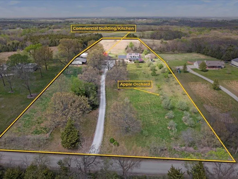 HUGE Price Improvement. Sellers have listened to your feedback and have priced aggressively! DO NOT MISS out! Are you looking to make additional income? Then look no more! Welcome to your dream country retreat! This custom-built 3-bed ( plus 3 non-conforming), 4.5-bath home sits on nearly 10 useable acres, offering space, comfort, and endless possibilities. With over 3,500 sq ft of finished living space, including a walk-out basement and 9-foot ceilings, youll love the real hardwood floors, solid wood doors, custom kitchen cabinets, and brand-new quartz countertops. Enjoy peace of mind with new upgrades like an A/C unit, garage doors, and a spacious deck (2025). Outside, grow your dreams with a greenhouse, 75-tree apple orchard, lavender & Elderberry for harvest, fenced pasture, and a 25x50 shop. The commercial building offers even more opportunityperfect for a business. rental, or creative space! Bring your home and business together all in one place! Tonganoxie school district as well ? Schedule your private showing today and discover all the ways this property can work for you!