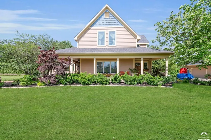 Peaceful country living with easy access to downtown Lawrence, De Soto, and the KC metro! This one-owner 1.5-story home sits on 10.1 acres and offers a light-filled open floor plan with a great room, bar, dining area, all-seasons room, and a true chef s kitchen featuring a Wolf induction range with convection oven, double-drawer dishwasher, dual full-size refrigerators, a built in cooler drawer and icemaker. Marmoleum and wood flooring flow through the main living areas. The main floor has everything you need including a private primary ensuite with full bath with heated floors, plus separate laundry and powder rooms. Upstairs, two oversized bedrooms with high ceilings, skylights, and a full bath offer space and abundant natural light. Step outside to enjoy the wraparound porch, fruit trees, berry bushes, firepit, and room to garden or explore. The 40x30 detached garage includes two-car parking, a separate bay for a tractor or mower, and a loft for storage or workshop. A full 9-ft basement provides room to expand! Measurements are approximate. Buyer/buyer s agent to verify square footage. The main floor includes everything you need private primary ensuite with a full bath and heated floors, plus separate laundry and powder rooms. Upstairs, two oversized bedrooms with high ceilings, skylights, and a full bath offer space and abundant natural light. Step outside to enjoy the wraparound porch, fruit trees, berry bushes, firepit, and room to garden or roam. The 40x30 detached garage includes two-car parking, a separate bay for a tractor or mower, and a loft for storage or workshop. A full 9-ft basement provides room to expand! Measurements are approximate. Buyer/buyer s agent to verify square footage.