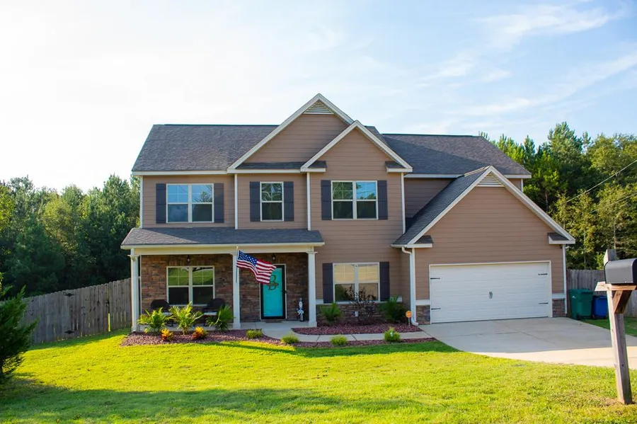 Spacious home on large 1.1 acre lot. Great layout! Kitchen with granite, walk-in pantry and island is open to great room. Downstairs has bedroom with full bath. Large play area upstairs. Master suite is big with double sinks, man sized tub & separate shower. Oil rubbed bronze fixtures throughout the home. Large back yard is partially wooded and completely fenced. Covered patio, storage building, well-built tree house/ fort. Gate in yard leads to Smiths Station Sports Complex and Walking Trails.