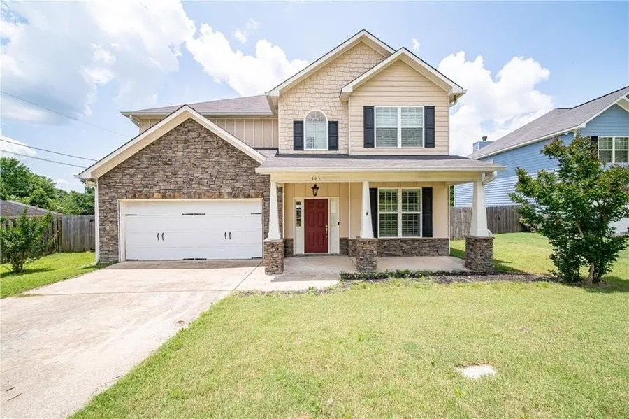 This charming Lee County 4-bedroom, 2.5-bath offers the perfect blend of comfort and style. Step inside to discover a formal dining room and an open-concept kitchen, featuring granite countertops, a convenient breakfast bar, and a pantry. The desk/coffee bar area is ideal while the abundance of cabinet space ensures you have room for all your culinary needs. Gather in the inviting living room, highlighted by a beautiful stone fireplace, where you can create lasting memories with family and friends as you prepare meals. The spacious primary bedroom serves as your private retreat, complete with an ensuite bathroom boasting double vanities, a soaking tub, and a large shower, along with an enormous walk-in closet. The three additional bedrooms are generously sized, each offering ample closet space, and the laundry room conveniently located upstairs makes chores a breeze. Step outside to the covered back porch, the perfect spot to relax while watching the kids play in the private, fenced yard. This home features lap floors, plantation shutters for added elegance, and a layout that prioritizes family living. Don't miss your chance to make this wonderful home your own! Schedule a viewing today and start envisioning your family's future here.