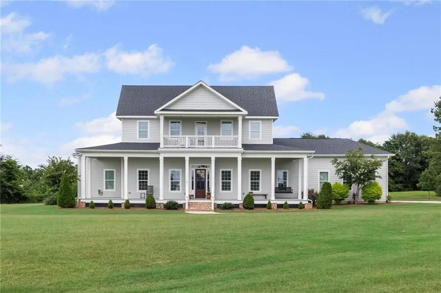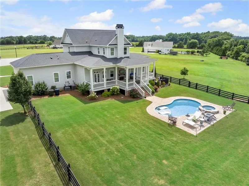 Discover a serene oasis on three pasture-like acres within the Auburn city limits at Cannon Lane, where the tranquility of the countryside seamlessly blends with city convenience. This thoughtfully designed 2018 home invites you to enjoy outdoor living with its oversized porches, swimming pool, and chicken coop. Upon entering, you'll be welcomed by a grand foyer showcasing double-height ceilings, a staircase leading to the second floor, and a formal dining room to your right. The inviting living room, anchored by a brick wood burning fireplace that continues into the outdoor space on the back porch, creates a cozy ambiance. The spacious kitchen, open to the living area, boasts a mix of black granite and white quartz countertops, farmhouse sink, gas oven/range, stainless steel refrigerator, custom wood hood, walk-in pantry, and a pot filler among its many features. Adjacent to the garage, you'll find functional mud and laundry rooms, both featuring impressive 12-foot ceilings found on the entire main level. The master suite is located in the back left wing of the home, complete with an ensuite featuring a double vanity, garden tub, tile shower, and spacious walk-in closet. The front left of the home houses a thoughtfully positioned second bedroom on the main floor. Ascend to the upper level where a landing leads to the home's third porch, offering views of the neighboring horse farm. This floor accommodates three additional bedrooms and two more well-appointed bathrooms, one of which is a jack-and-jill, providing ample space for family or guests. A tankless gas hot water heater supplies endless hot water to the home.