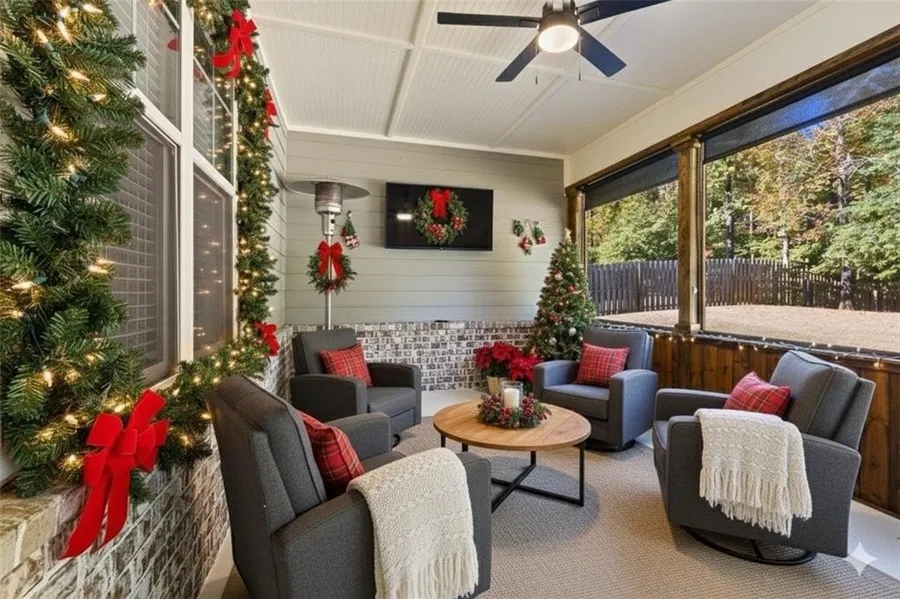 This 4-bed, 2.5-bath residence blends an open layout with classic touches: a formal dining room with a coffered ceiling, a breakfast room, and a chef-friendly kitchen anchored by a large island and walk-in pantry. High ceilings carry throughout, keeping everything bright and airy. The generous primary suite features a soaring ceiling, two spacious closets, and a spa-style shower with built-in seating and a garden tub. Everyday living is a breeze thanks to the mud room with bench and the laundry room located just inside the home by the door of the insulated two-car garage. Recent updates make it move-in ready: the interior and front porch were freshly repainted, and the custom screened-in porch was newly stained—perfect for morning coffee or game-day evenings. Outside, a fenced backyard backs to wooded views for privacy and play.