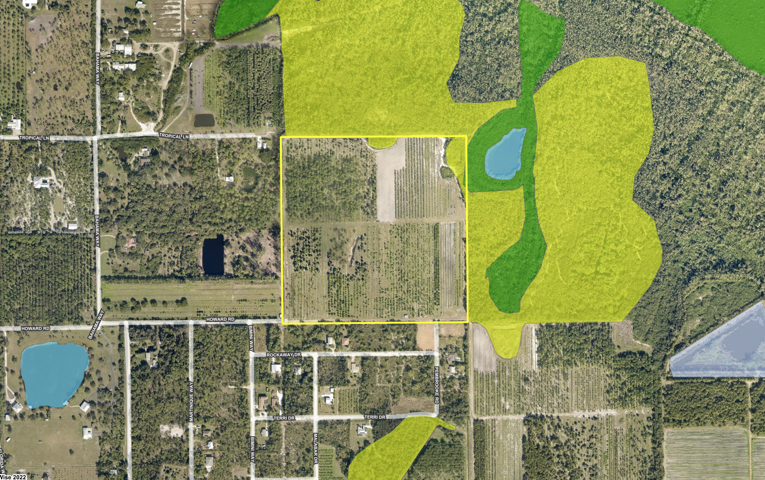 There is an 8" well and an active SFWMD WUP (36-03637-W) which allows for an annual allocation of 46.4537 Million Gallons. It's mostly high and dry with approximately only two acres of wetlands. Soils consist of Hallandale and Immokalee.